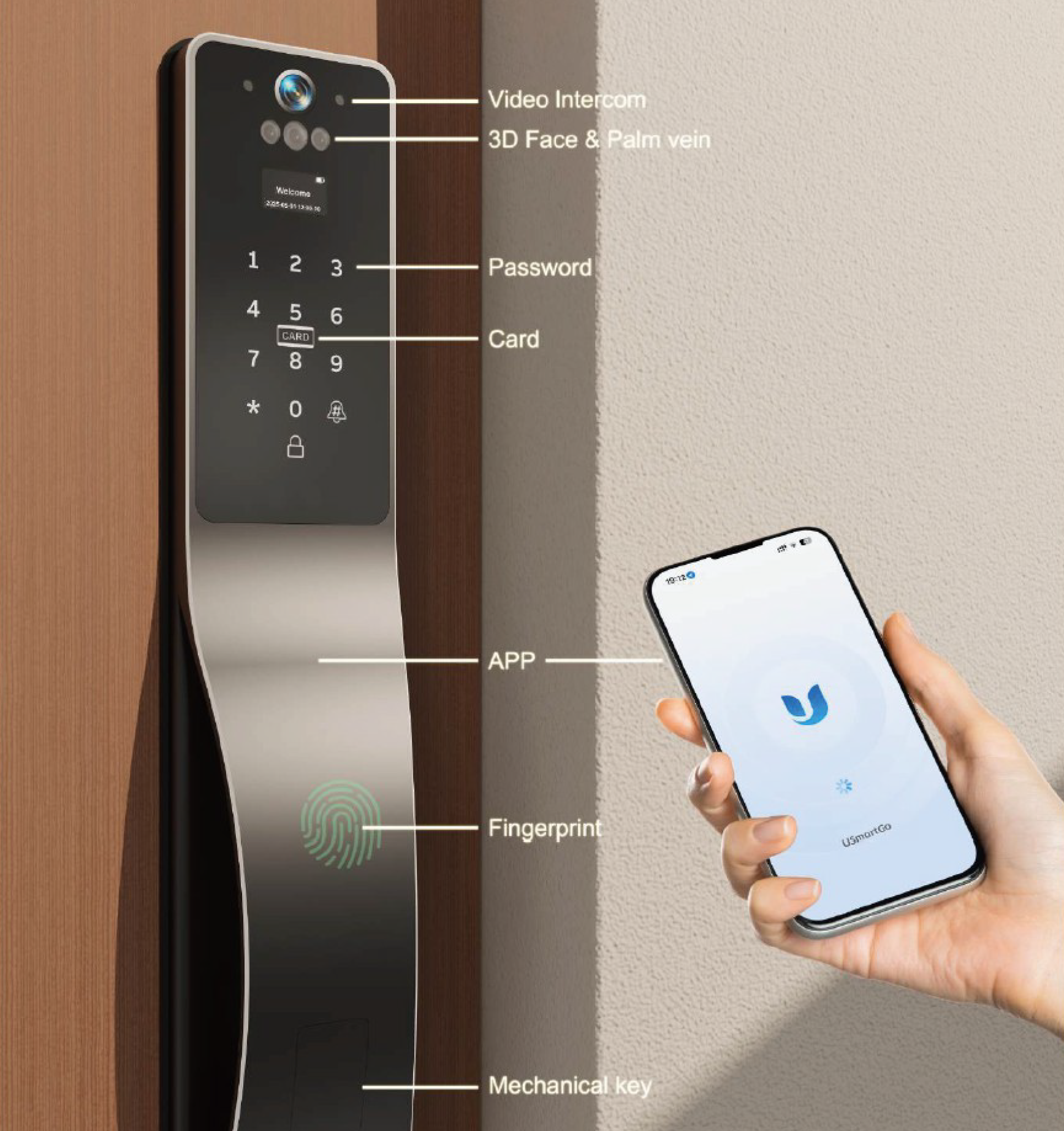 - Multiple unlocking methods: fingerprint, PIN, RFID card, Bluetooth app, Wi-Fi (via gateway), and mechanical key