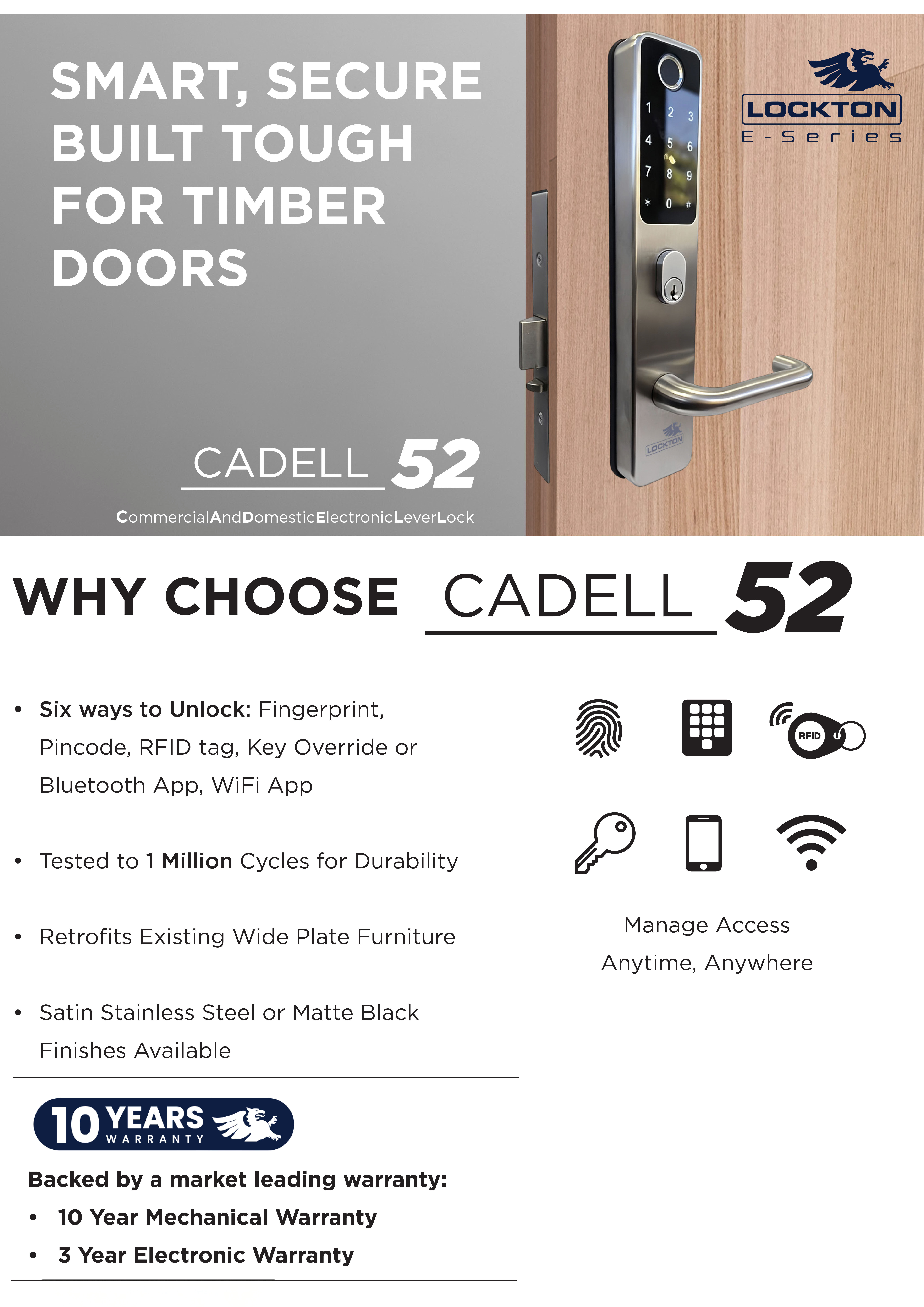The CADELL52 is a commercial-grade electronic lever set that retrofits directly to Australian mortice lock furniture and replaces many knobsets, leversets and deadbolts. Designed for demanding environments, it combines modern access control with weather protection and fire performance in a robust stainless steel form factor.