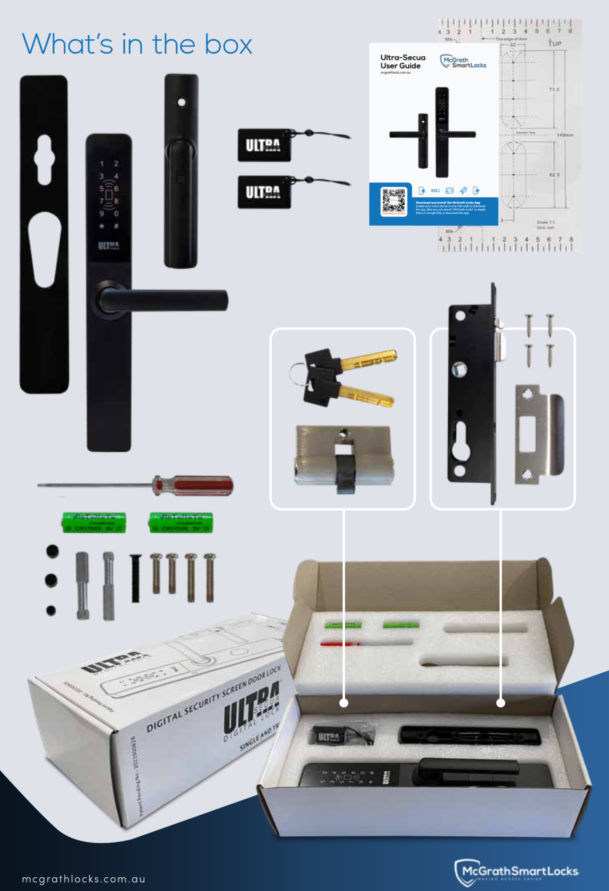 The McGrath ULTRA-SECUA Dual Unlock Smart Lock is a purpose-designed digital security lock for hinged screen doors. It provides keyless entry using PIN codes, RFID access cards or tags, and Bluetooth-enabled eKeys via the McGrath Locks App, with a mechanical key override for backup entry.